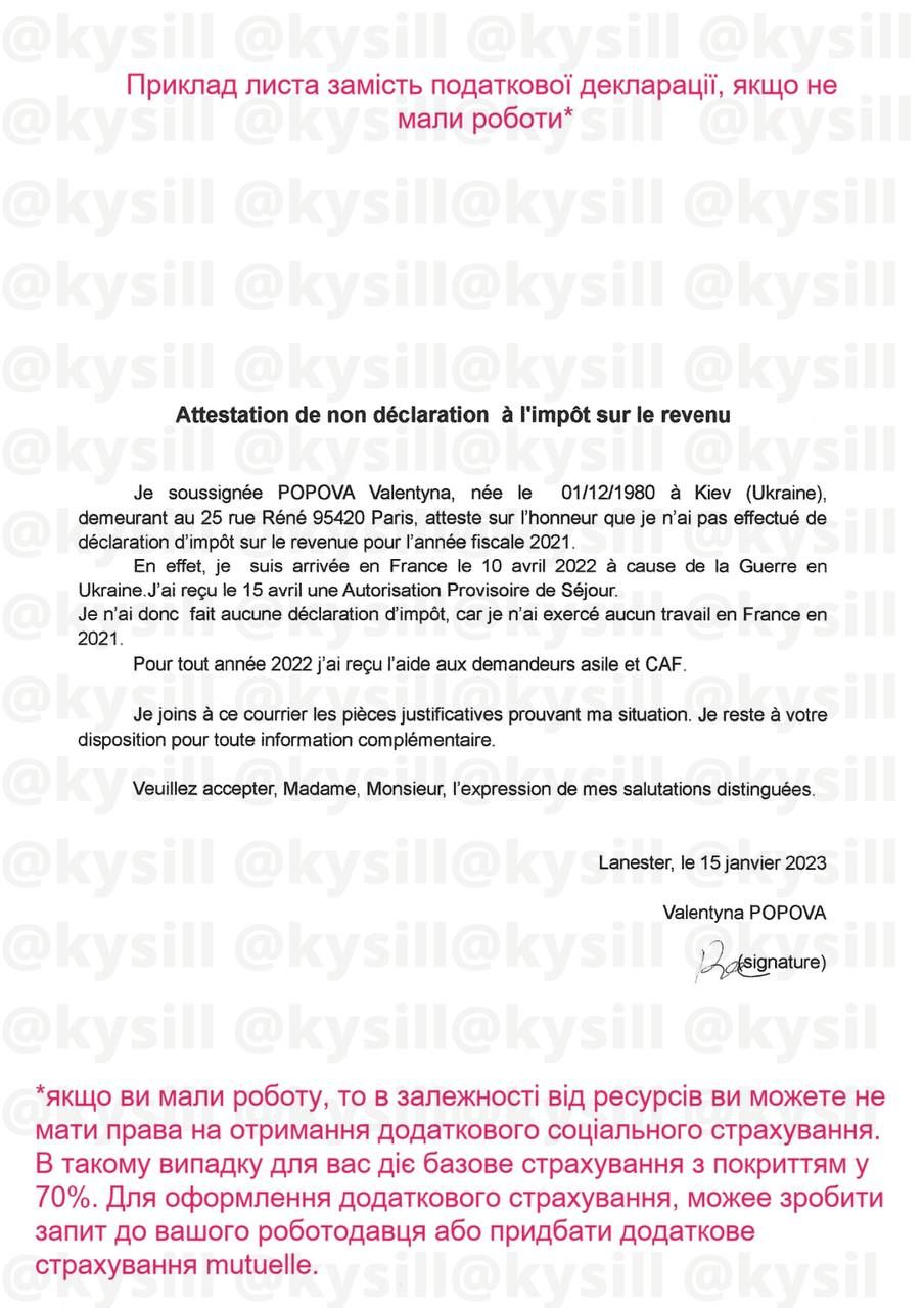 Подається написана від руки, або ж друкованому вигляді Attestation sur l’honneur (Заява). В якій ви вказуєте отримані за цей період доходи у Франції ( Вказувати також допомогу ADA, CAF та інші соціальні виплати на вашу сім’ю та вас) й за кордоном та обіцяєте подати податкову декларацію у встановлені законом терміни.